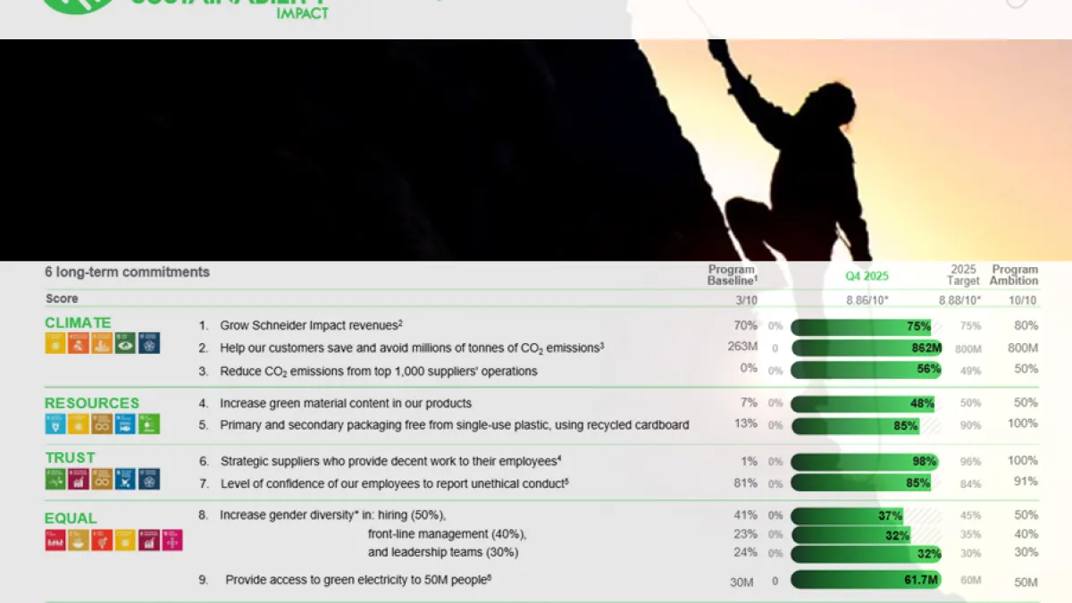 Der Technologiekonzern Schneider Electric hat die Ergebnisse seines Nachhaltigkeitsprogramms für den Zeitraum 2021 bis 2025 vorgelegt. Mit dem Abschluss des sogenannten Schneider Sustainability Impact (SSI) Programms zieht das Unternehmen eine Bilanz seiner Aktivitäten in den Bereichen Klima, soziale Verantwortung und Unternehmensführung. Zum Ende des Jahres 2025 erreichte das Programm eine Gesamtbewertung von 8,86 von 10 Punkten. Diese Kennzahl zeigt den Fortschritt, den Schneider Electric bei der Integration nachhaltiger Strategien in Geschäftsprozesse und Wertschöpfungsketten erzielt hat. Über mehrere Jahre hinweg wurden definierte Ziele in konkrete Maßnahmen übersetzt und weltweit umgesetzt.