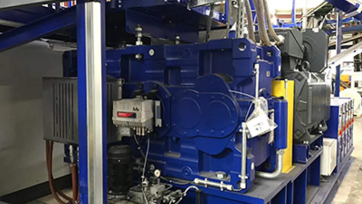 Bei den beiden Extrudern handelt es sich um prozessrelevante Anlagen, auf denen EPDM-Bahnen in einem kontinuierlichen Verfahren extrudiert werden. Angetrieben werden diese durch je ein Stirnradgetriebe der Baureihe X von SEW-Eurodrive. Mit einer Übersetzung von circa 60 und einem Nenndrehmoment von 270 kNm übertragen die Getriebe das für den Extrusionsprozess erforderliche Drehmoment. Externe Axialkräfte, die durch die Plastifizierung des EPDM-Granulats im Schneckenbereich entstehen, nimmt ein axiales Drucklager am Getriebe auf. Um Aussagen über den Zustand des Getriebes treffen zu können, wurde das SEW-eigene Condition-Monitoring-System "DriveRadar" installiert. Hardwareseitig besteht es aus einem Sensorpaket zur Erfassung der Betriebsparameter und einer Edge Processing Unit (EPU), die die gesammelten Daten über Mobilfunk an die SEW-Cloud sendet.
